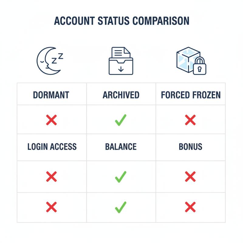 | 比較項目 | 休眠口座 | アーカイブ口座(放置凍結) | 強制凍結(規約違反) |